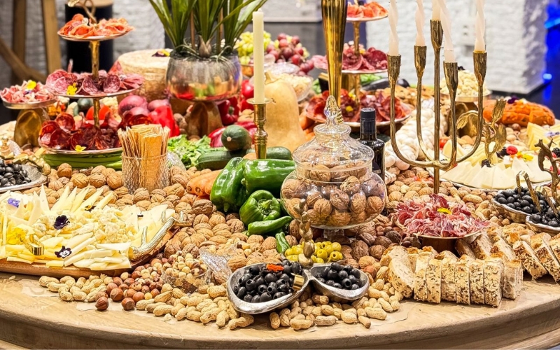 Quesos artesanos, embutidos ibéricos, panes de masa madre, frutas de temporada, frutos secos, dulces y propuestas creativas se combinan en una composición que invita a los invitados a acercarse, servirse y compartir.