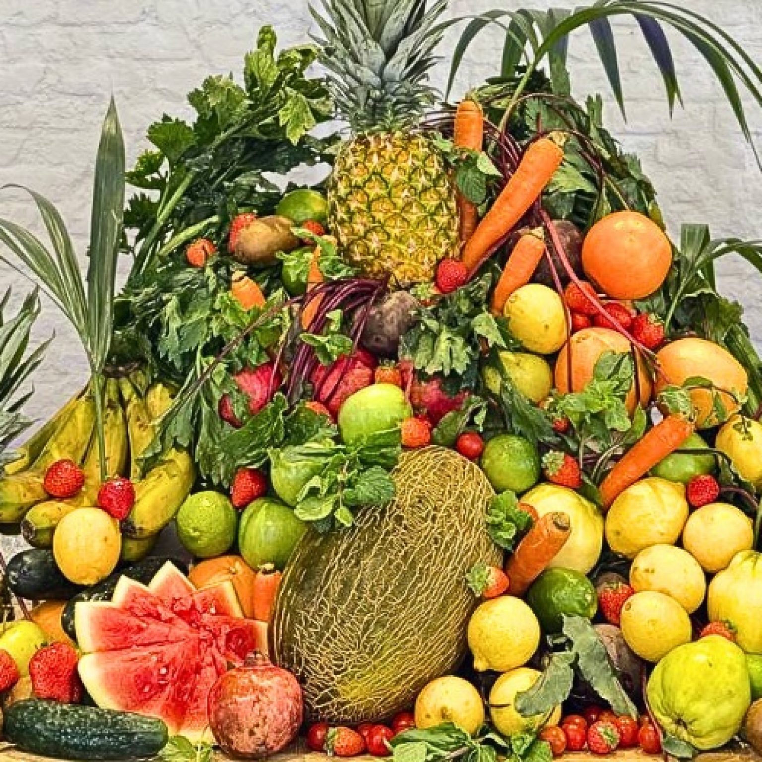 Un rincón vibrante y natural lleno de frutas frescas, vegetales coloridos y energía viva.